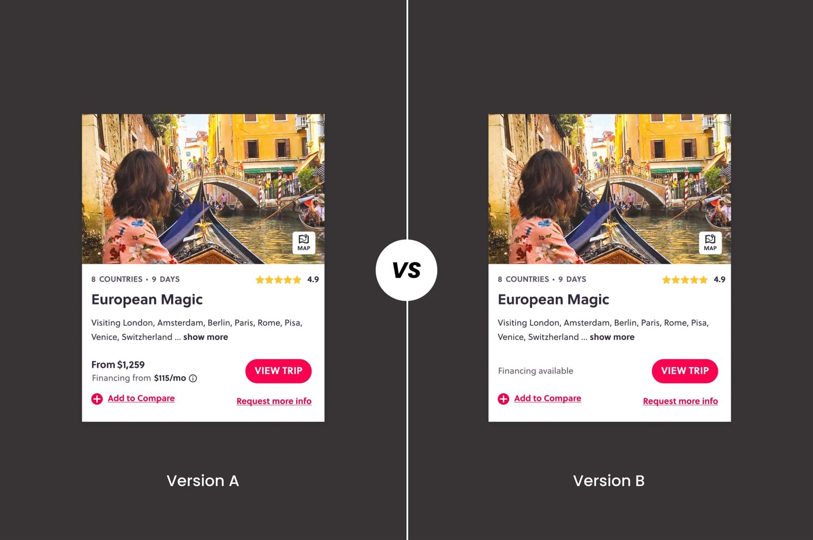 In this ab test, the element in question is a product card, displayed on the search results page while people are looking to purchase a travel product. There is a hypothesis that, if people are not seeing the price on this search card, they would be more likely to browse through more trips that might be of interest to them. After that they choose a product, they would be able to see the price inside the individual trip product page.